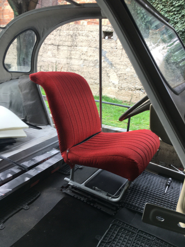 Je n'ai pas terminé d'habiller le siège, car j'avais appris qu'il allait pleuvoir samedi. Une fois les sommiers posés, j'ai installé le siège avant gauche, la batterie et j'ai démarré la 2CV !!