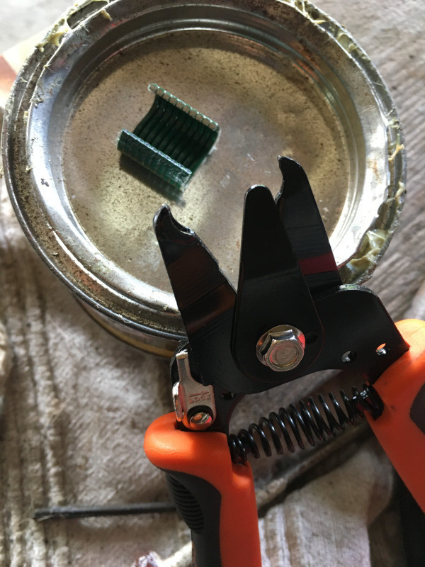 Pour la pose des agrafes de fixation, j'ai utilisé, comme je l'avais lu sur ce forum, une pince à agrafer les clôtures. Simple, pratique et bon marché !