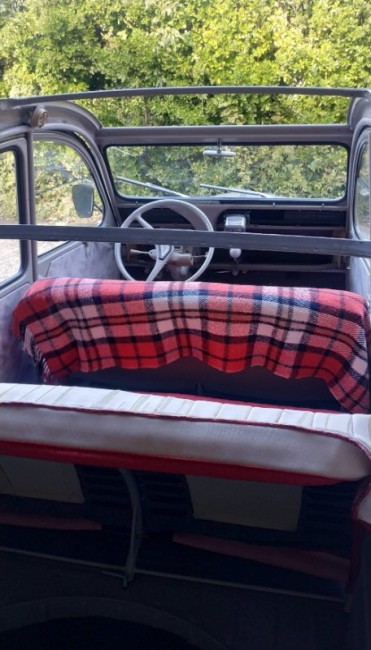 Aujourd'hui, on a mis les banquettes, la capote, la malle arrières, les pare soleil et j'ai installé dans la malle la roue de secours + le cric + la manivelle + la cale en bois + le cache calandre quand il fait froid.