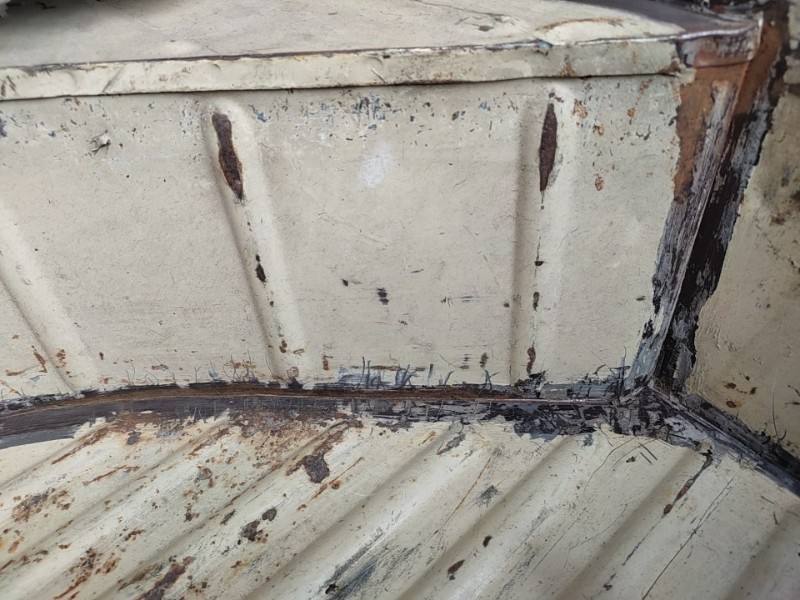 J'ai décidé d'enlever le joint de mastic au niveau du fond de coffre, j'avais envie de voir ce qui se cache dessous, eh bien il y a de la rouille, c'est superficiel, non perforant mais ce serait dommage de négliger ce point. Je pense mettre à blanc le fond de coffre car au gré des chargements la peinture est partie par endroits et il y a aussi de le rouille.