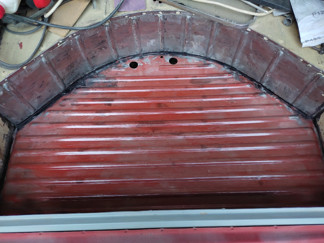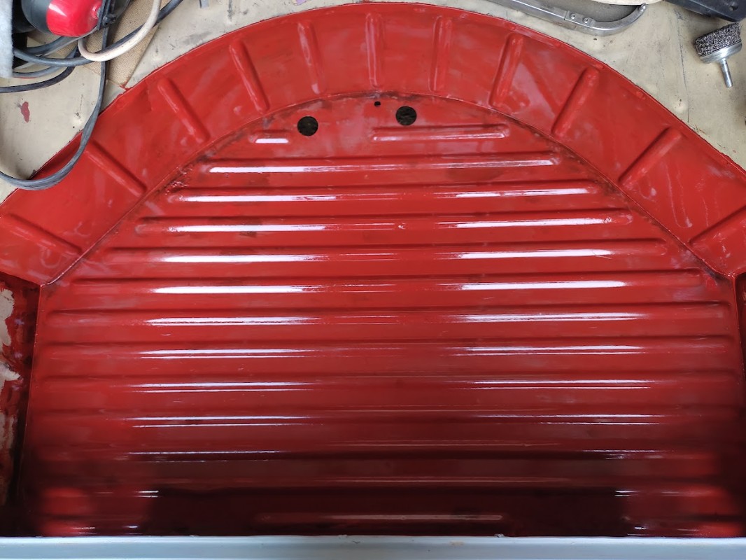 Petite avancée, le fond de coffre poncé à blanc, passage d'un filet de férose au niveau des jointures de tôle et CIP sur le reste. J'ai pas prévu de faire le caisson sous banquette, mais je me pose quand même la question car après c'est les planchers qui eux sont neufs et le dessous a été fait entièrement.