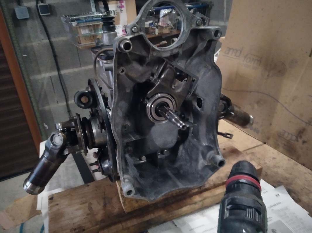 Deux ans après sa dépose, la boîte de vitesse est remontée et mise en huile (je la changerai à nouveau car elle va être chargée en WD40).