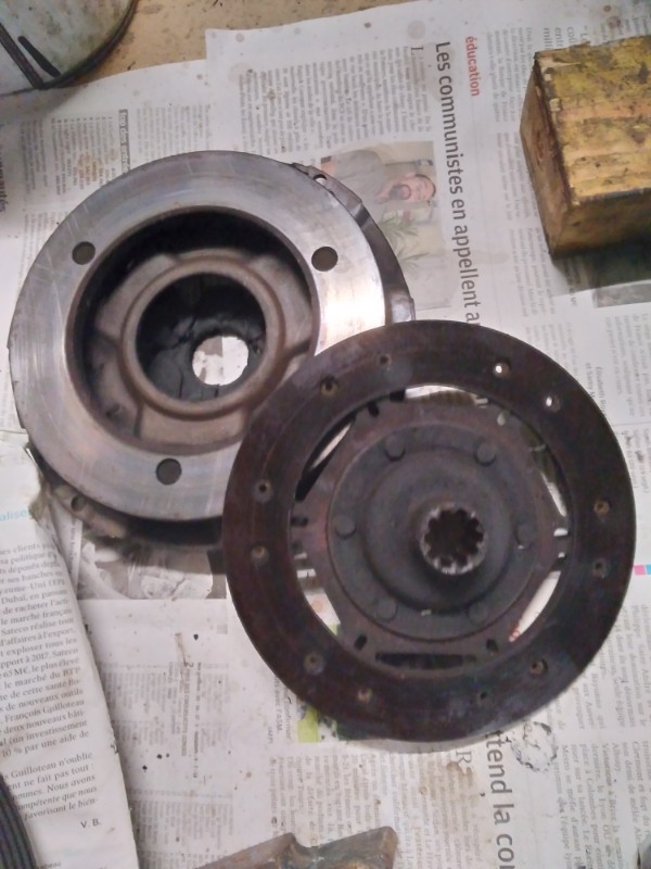 Le disque d'embrayage n'a pas de garniture contrairement à l'autre et au neuf.