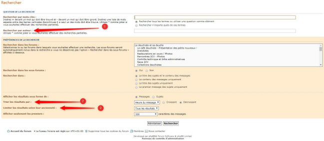 Je ne comprends pas ! Il suffit juste de taper ton pseudo dans la zone 1 "Rechercher par auteur" et de lancer la recherche dans la foulée ... Il te sortira alors tous les posts dont tu es l'auteur.