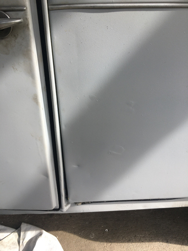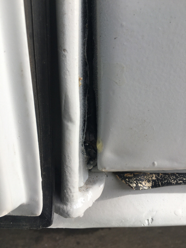 Côté intérieur de la membrure de la porte, il y a un trou, inaccessible pour le souder, sauf à faire une large ouverture qu'il faudra fermer ensuite...