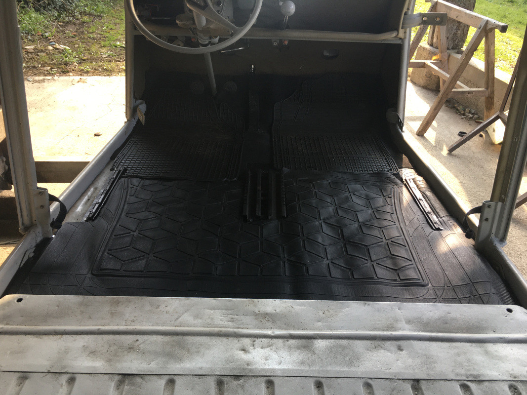 Je précise : ce sont des tapis (y compris le tapis de yoga à l'arrière !) vendus chez LIDL autour d'une dizaine d'€ pour les grands, comme l'ensemble des petits. A l'avant, j'ai acheté du caoutchouc chez un vendeur local, il m'a coûté 50 €.