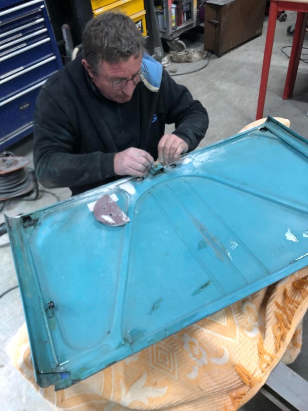 donc découpage de la tôle pourri fabrication d'une tôle j'ai percé 2 trous plus loin pour faire une soudure bouchon pour tenir la tôle remis soudage meulage et traiter convertisseur de rouille ecar