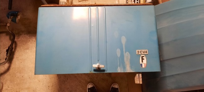 Ce matin j'ai poncé au grain 400 la malle arrière, après avoir décollé l'autocollant et récupéré le sigle 2CV4 en alu.