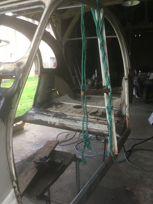 J'ai alors ramené le châssis à l'atelier, et présenté la caisse au-dessus, à l'aide de ma grue d'atelier. La caisse était simplement suspendue par une corde.