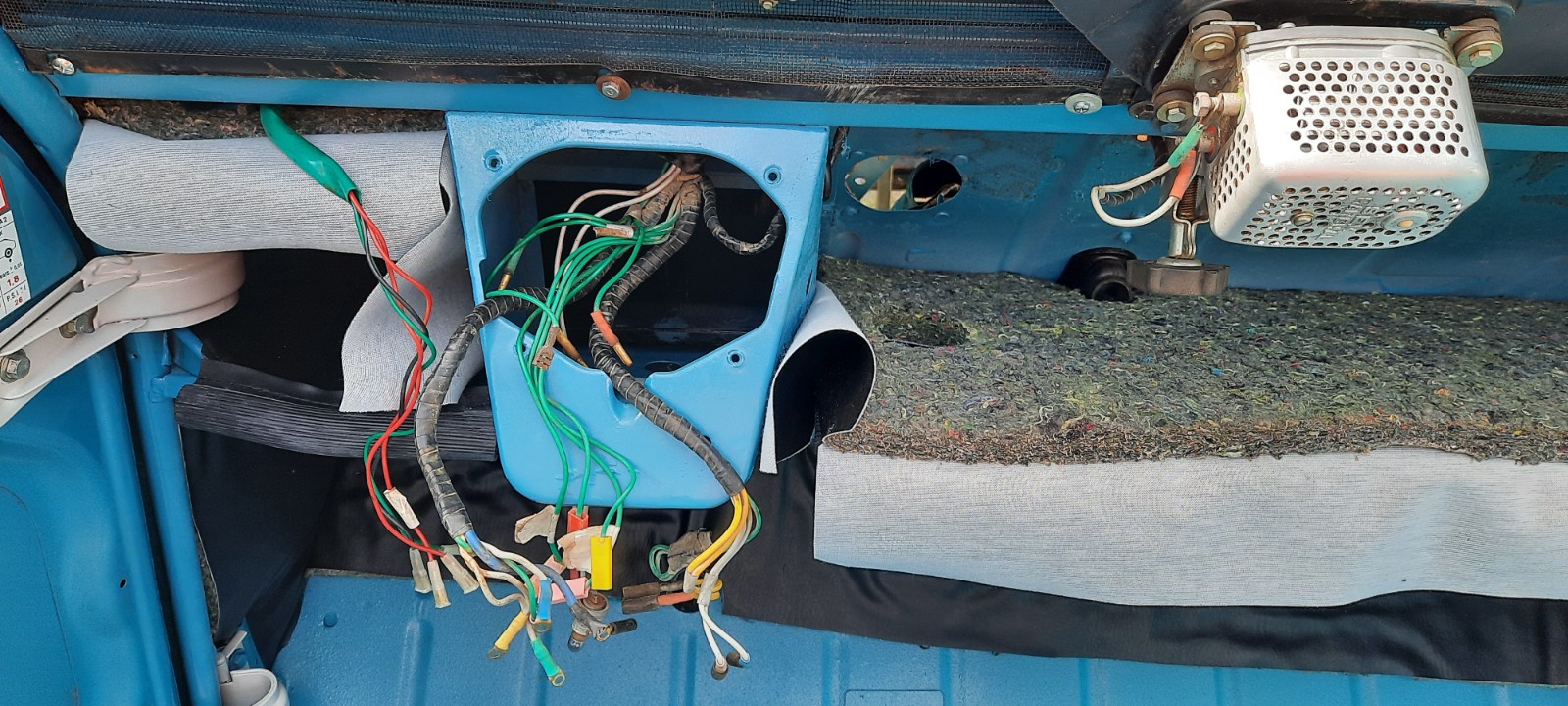 Passage du faisceau électrique, montage et réglage des portes avants, mise en place de l'insonorisant de la tablette, du levier de vitesses, passage du câble de compteur, de la buse de dégivrage et enfin pose provisoire du compteur de vitesse.