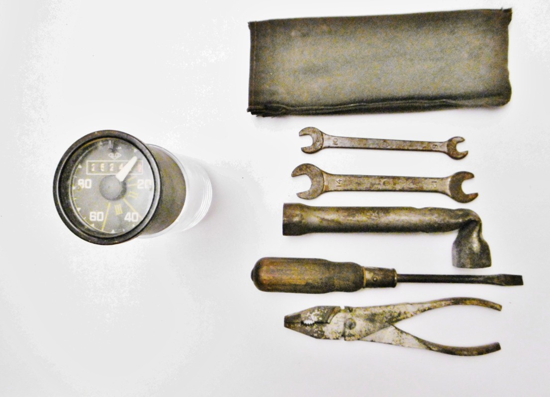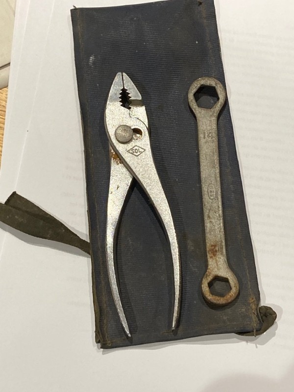 - Lot de bord complet pince ARP, tournevis virole courte, clef à bougie coudée à l’équerre non emboutie, deux clefs ser plates longues à fourche, trousse coutures parallèles;