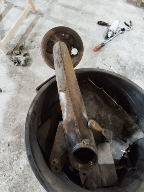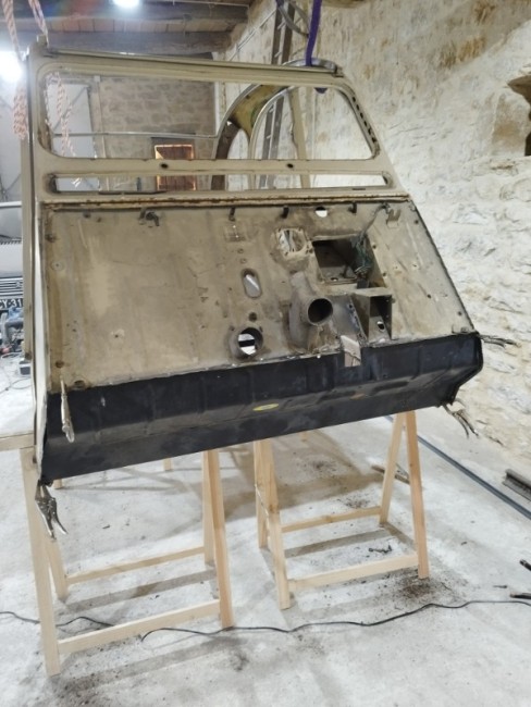 De retour de vacances j'ai donc laissé le chantier de la caisse dans ma grange, après avoir terminé le châssis et l'essieu arrière, je suis donc remonté avec dans le coffre moteur et boite, ici j'ai que 15m2 pour bosser, c'est plus la même !!!!