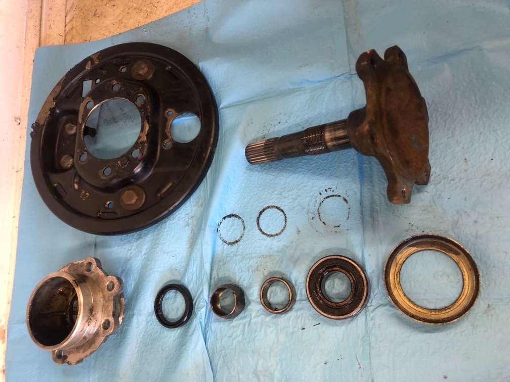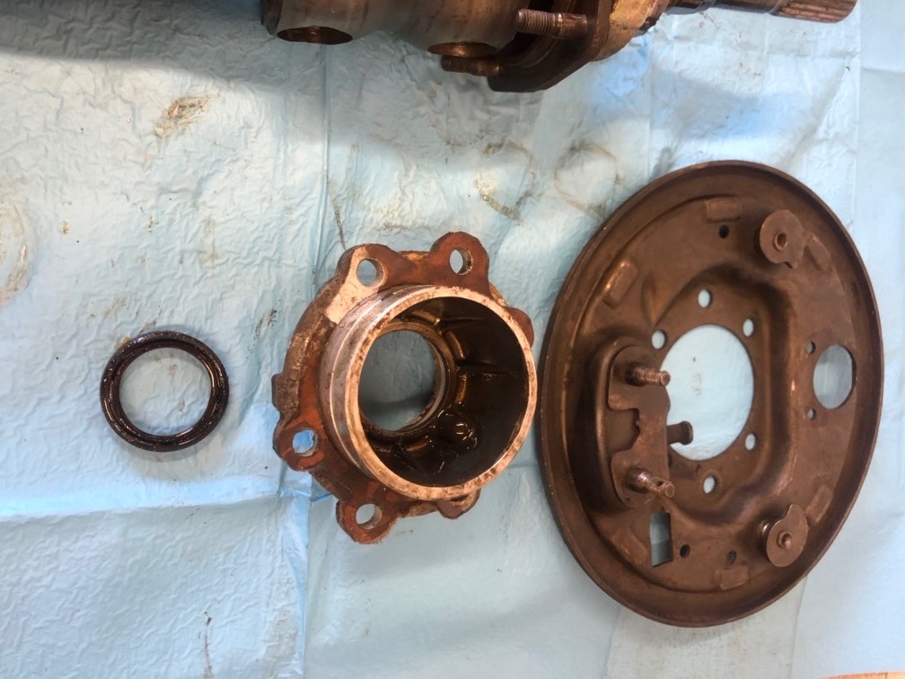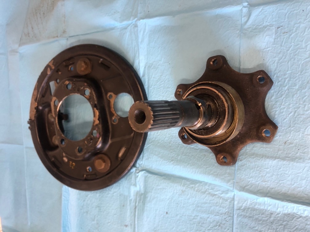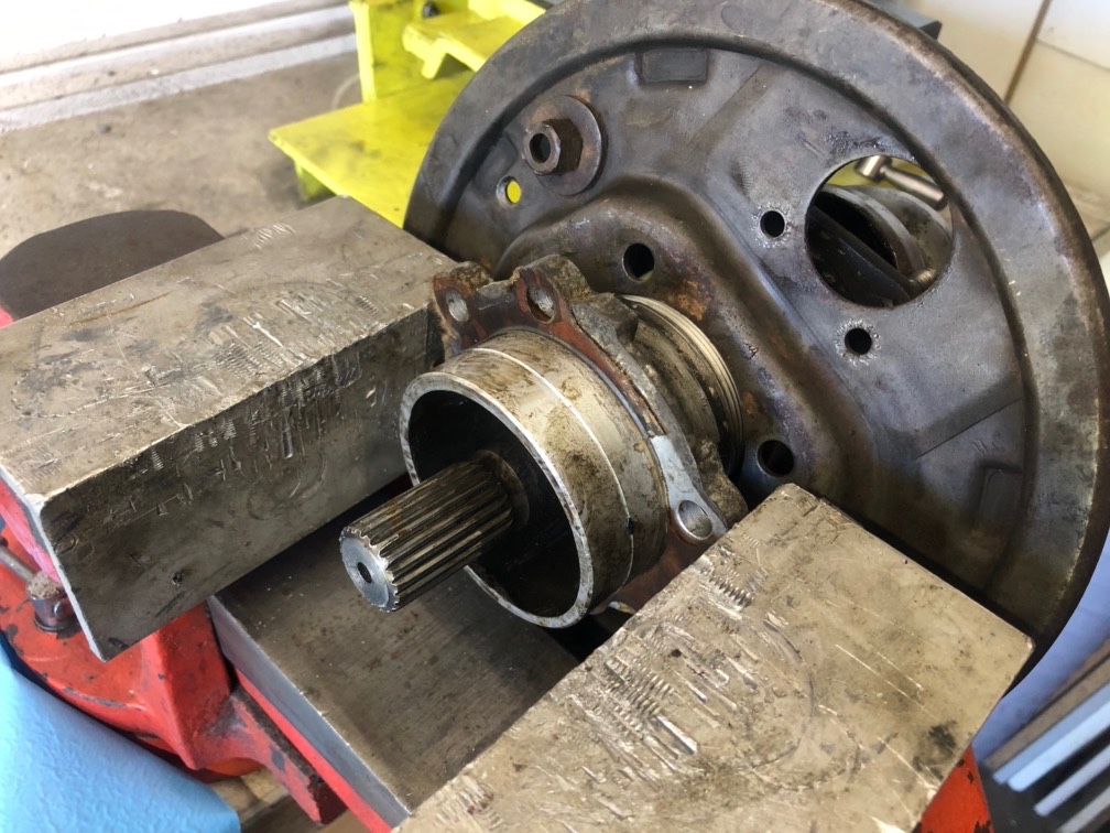 Démontons cette sortie de BV, pour frein à tambour et à joint homocinétique à bille (aussi appelé joint Rzeppa, du nom de son inventeur)(et par construction, un joint de Cardan ne peut pas être homocinétique)
