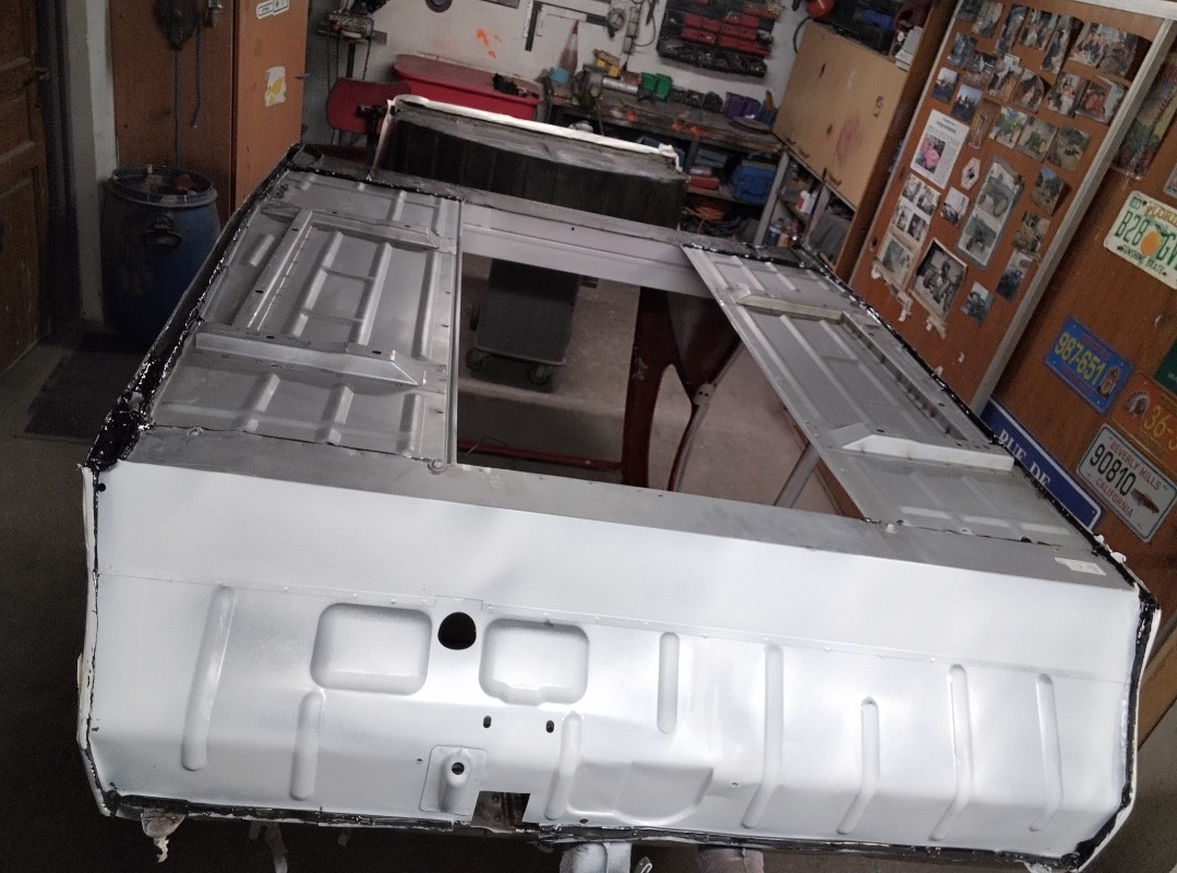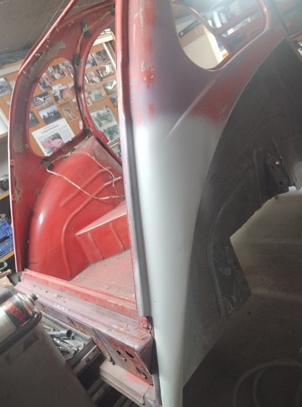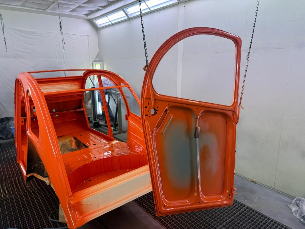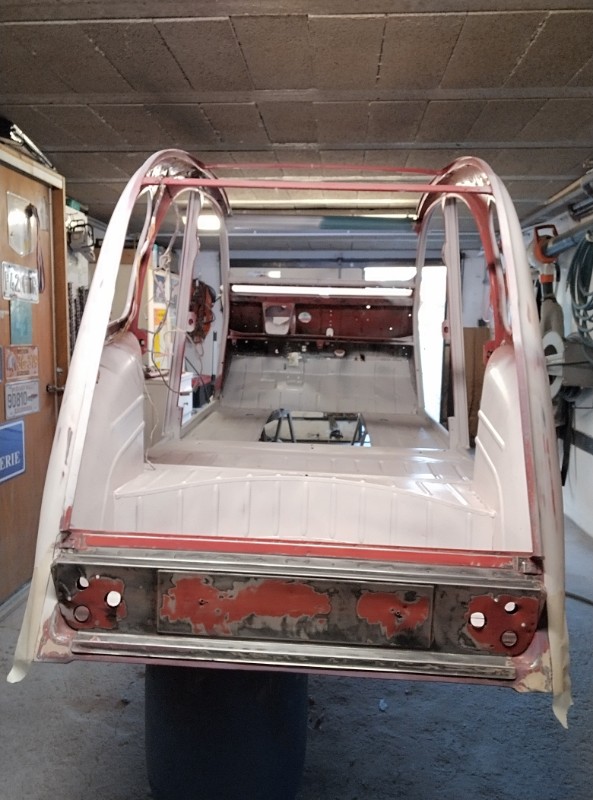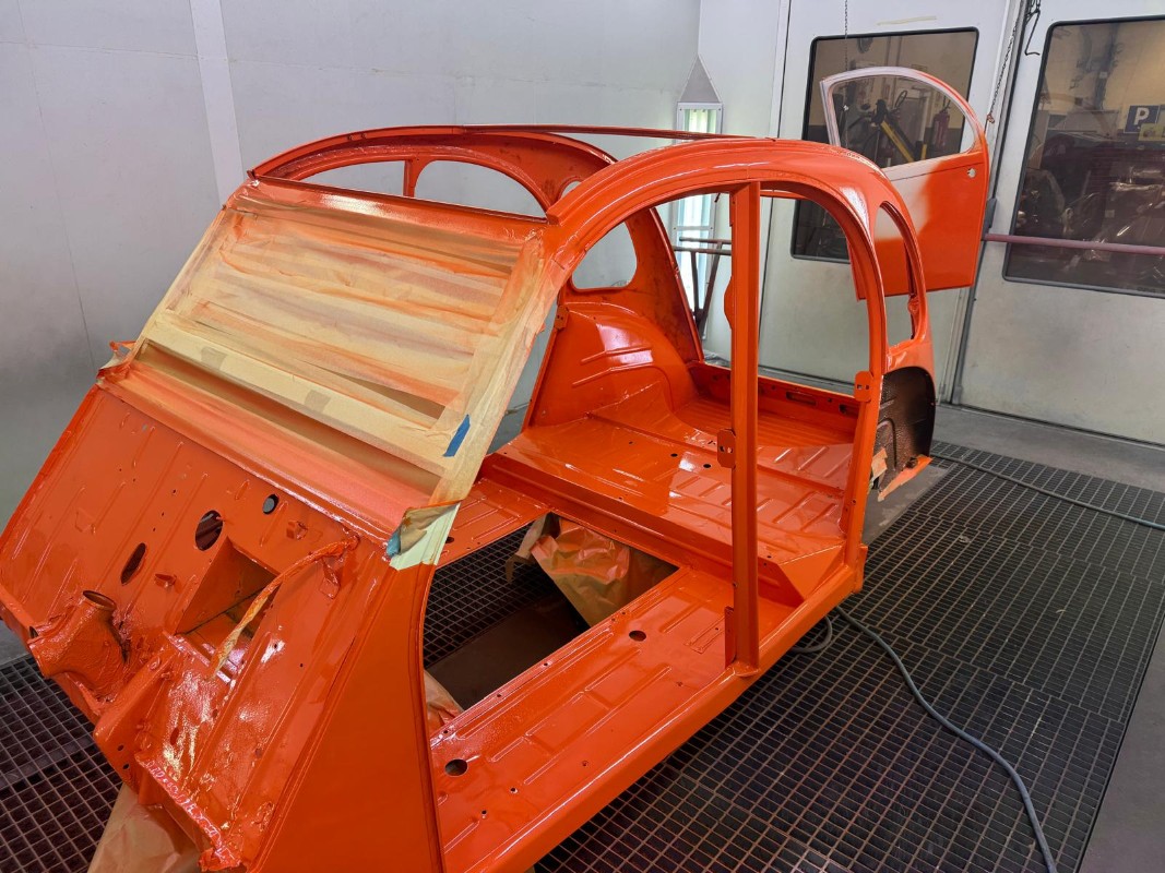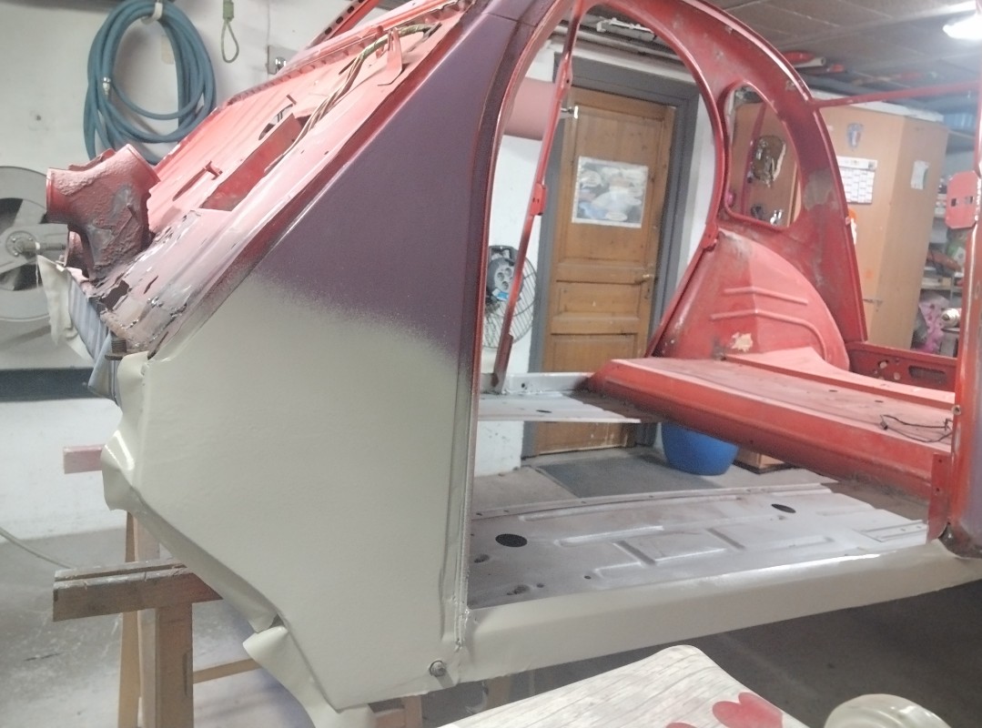 Mise en peinture jupe arrière et baie de pars brise blanc Semaine prochaine mise en cabine pour application de l orange puis ponçage 1200 a l eau puis application du vernis