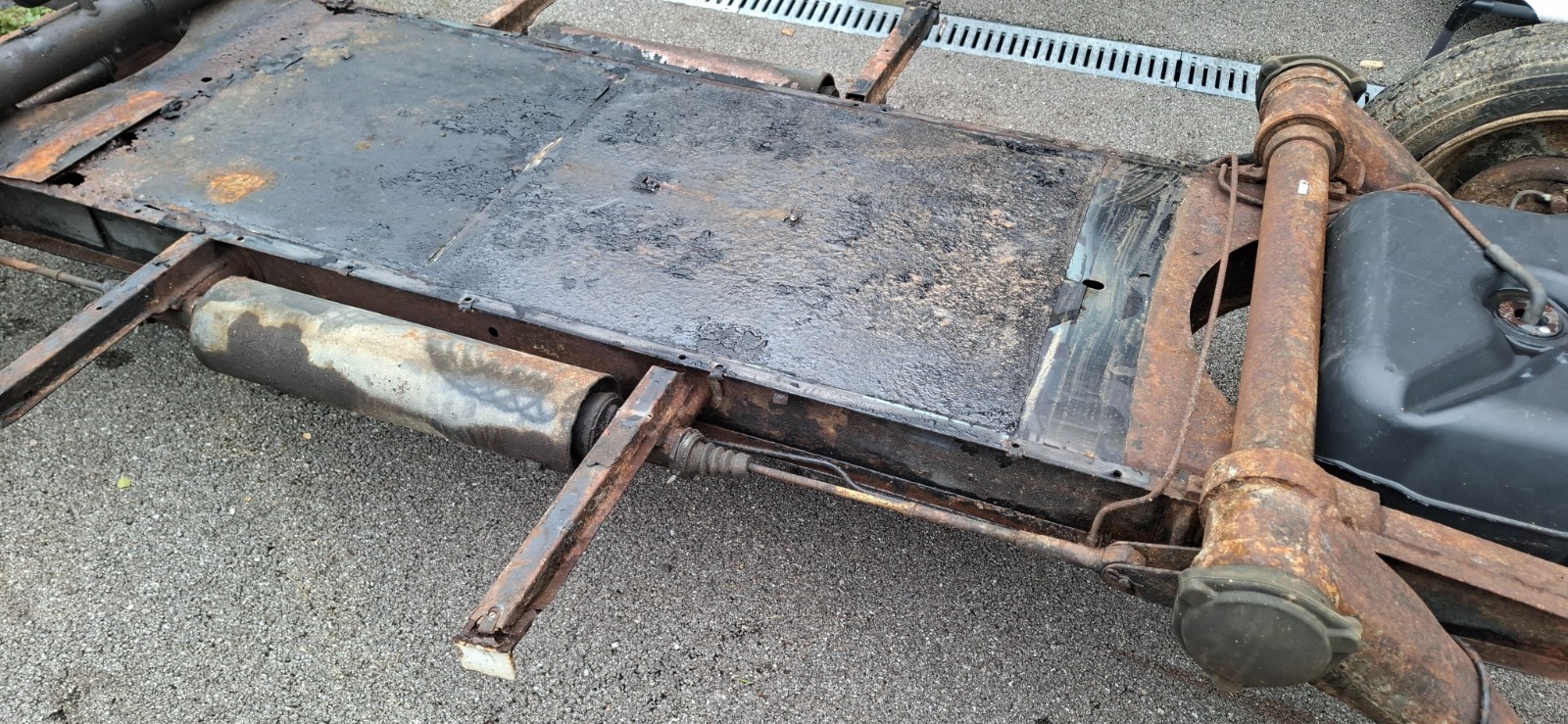 Je vais commencer par le châssis... remplacement de la tôle supérieure du chassis... derouillage complet à la mano ou sablage selon le tarif... inhibiteur de rouille, antirouille, apprêt epoxy et peinture antigravillon...