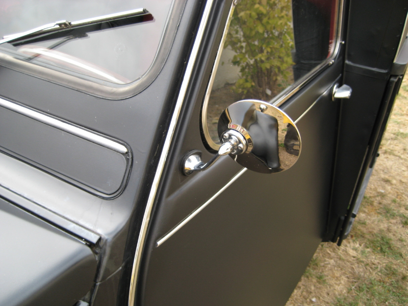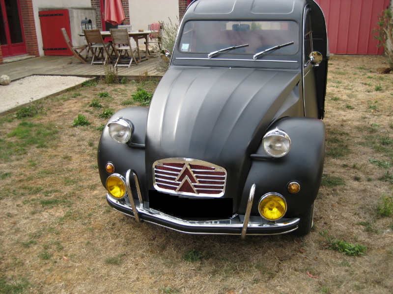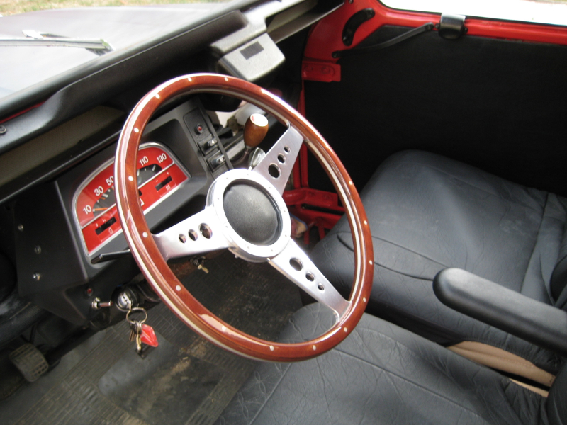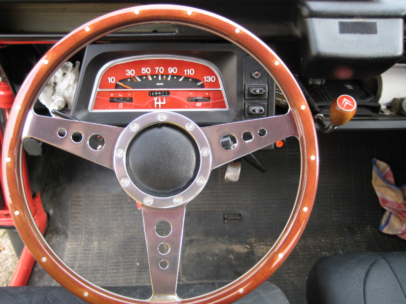 Pare chocs av chromé et longues portées , adaptation de rétro Burton , bordure de jantes chromés , pose d'une barre stabilisatrice d'ami 8 , et volant en bois Motolita ,pommeau bois.