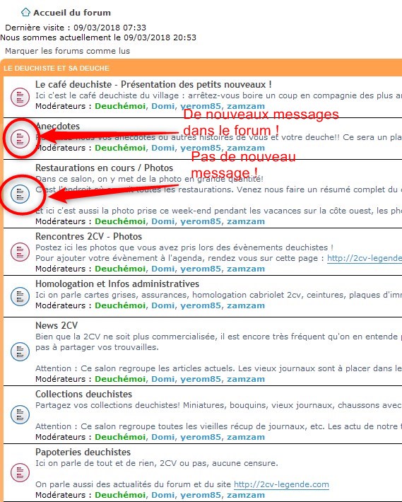 Chaque forum avec un nouveau sujet est marqué en rouge et dans le forum, les topics avec un nouveau message sont aussi indiqués en rouge !