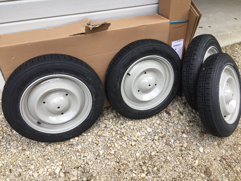 Après sablage, après, ponçage,peinture en gris rosé AC136, et montage des pneus, voilà ses jantes prêtes à reprendre la route.