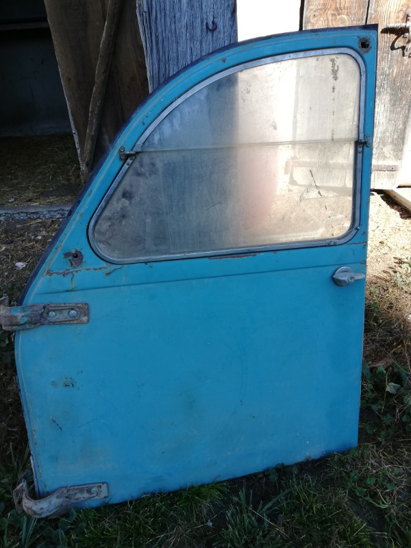Lorsque j'ai récupéré l'AK 400, le propriétaire ,qui est un ami de la famille, m'a conté sa mésaventure survenue dans les années 90 au volant de l'AK : il avait garé sa voiture sur un chemin que bordait un fossé assez profond, plus d'un mètre d'après lui. Le voilà parti dans le champ voisin pour s'occuper de l'arrosage de sa parcelle de maïs ( dans les Landes c'est très courant). De retour, il constate que la Deudeuche n'est plus à sa place mais les deux fers en l'air dans le fossé; l'oubli de serrer le frein à main lui a été fatal...Bon pas trop de mal, sauf que le côté gauche de la voiture a souffert...et c'est ainsi que j'ai récupéré la voiture avec une installation pas très catholique pour arriver à fermer la porte gauche : les charnières sorties de l'intérieur et fixées sur la portière à l'extérieur