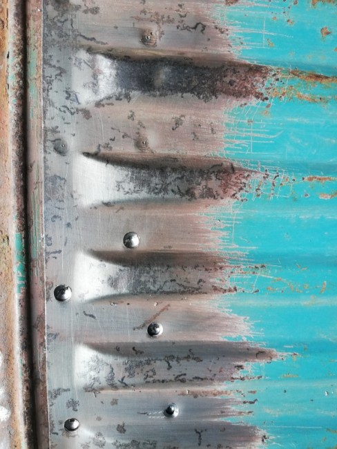 D'abord décapage de la peinture au chalumeau : pointage à la pointerole des points de soudure...54 au total, puis perçage à la mèche de 6 : Après découpage des deux brasures situées juste au pied d'entrée droit et gauche et avec l'aide d'un burin bien affûté pour faire sauter les quelques perçages récalcitrants, la jupe est descendue ! enfin...