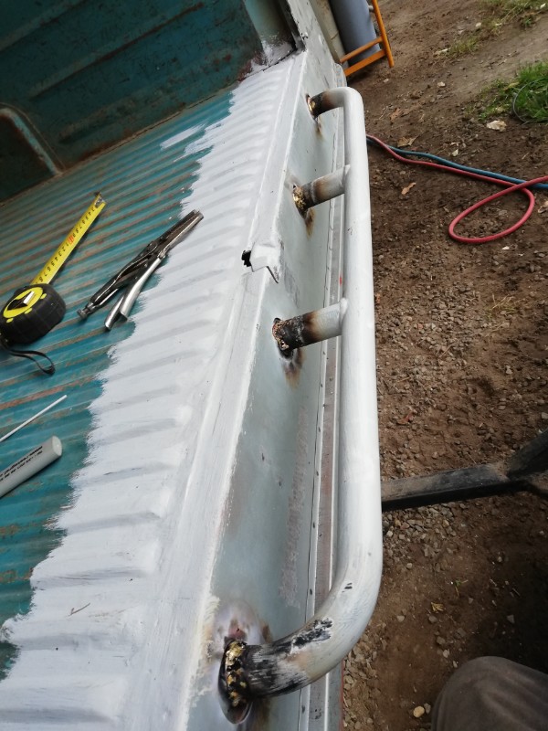 J'ai mis un apprêt garnissant sur les parties qui ont reçues les soudures par bouchonnage pour préserver la tôle que j'ai mise à nue...pour éviter qu'elle ne rouille avec l'humidité à 100 % en ce moment.