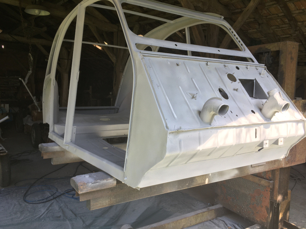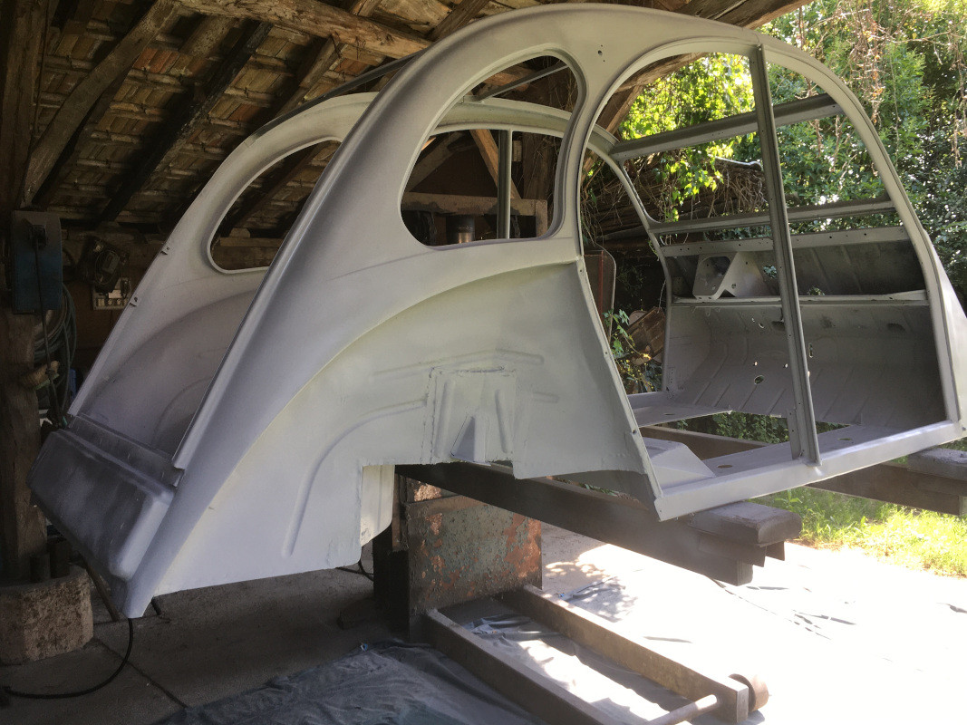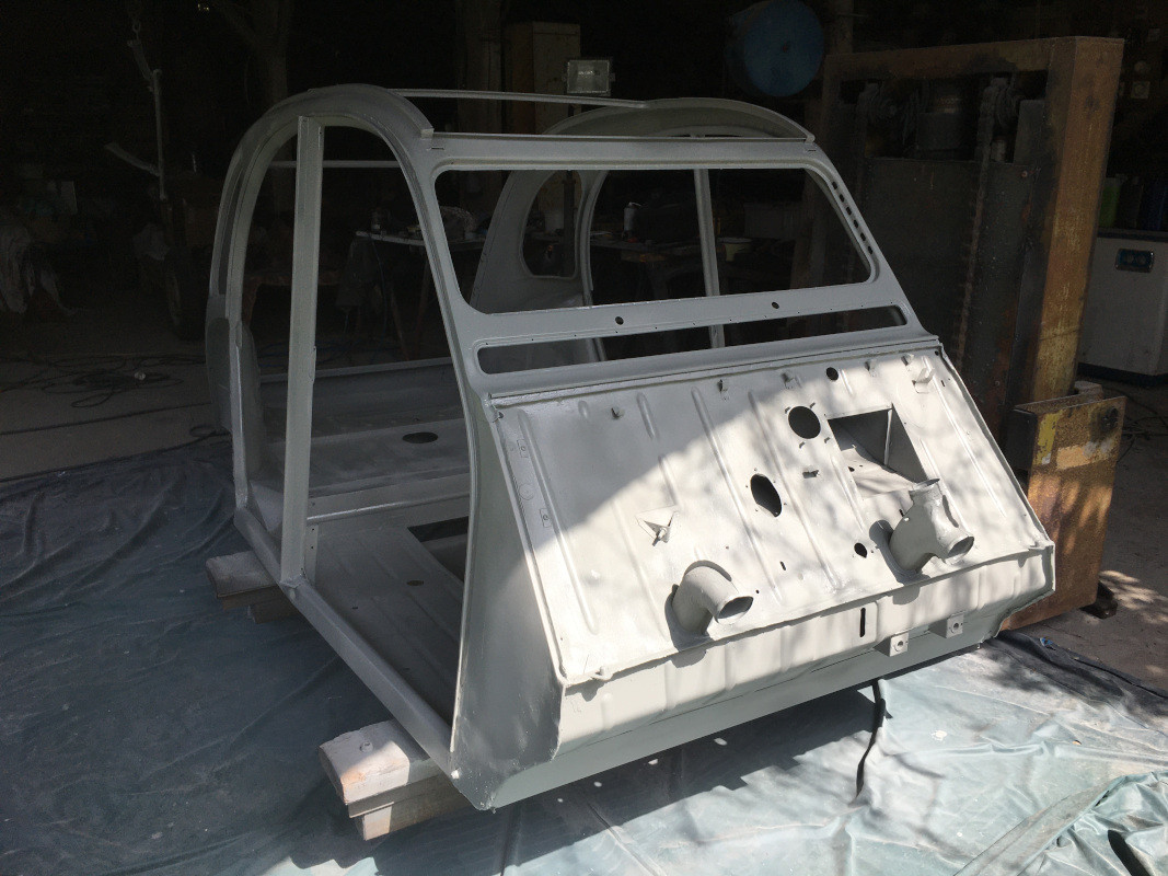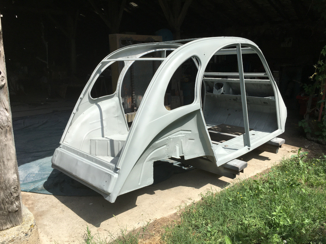 J'ai commencé par la tôle d'auvent, puis l'intérieur (en laissant les entrées pour la fin, pour ne pas que le tuyau d'air fasse des traînées dessus), les soubassements, les planchers, la baie de pare-brise, les tôles latérales d'auvent, les côtés autour des custodes, et j'ai terminé par les bas de caisse.