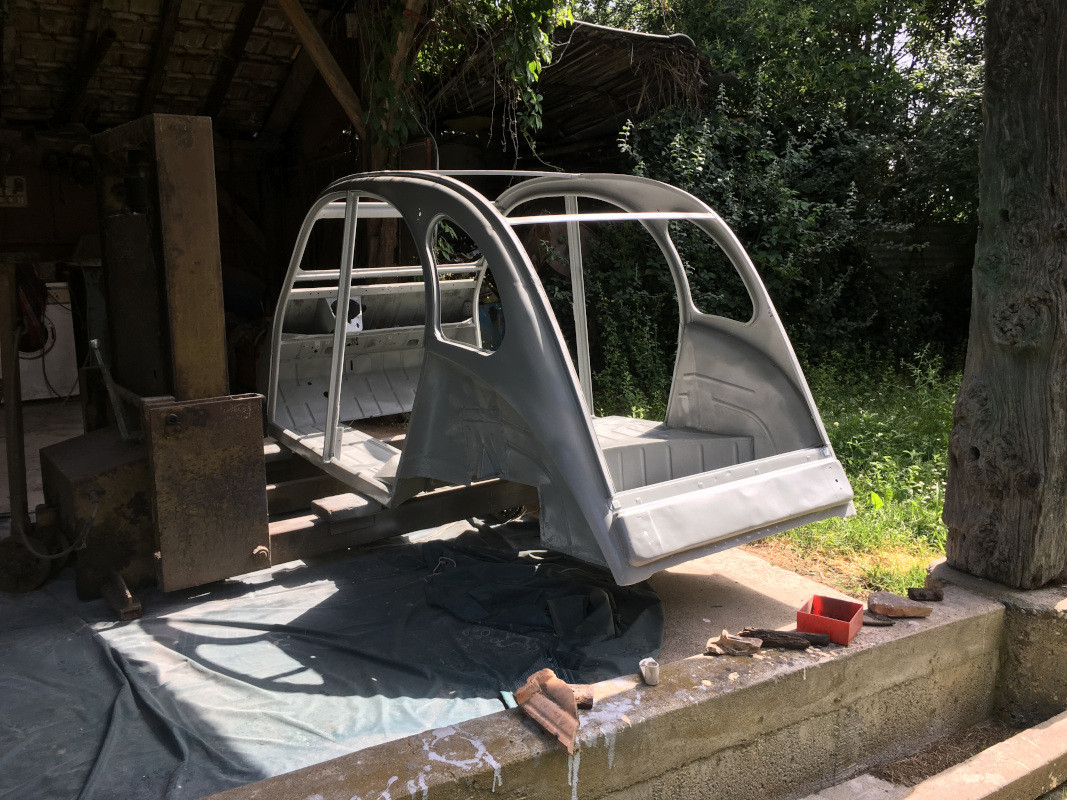 J'ai passé à peine deux couches, car j'ai manqué de peinture (on voit les pare-chocs et l'auvent pas finis...), "mouillé sur mouillé", c'est-à-dire, deux couches à 10 minutes d'intervalle...
