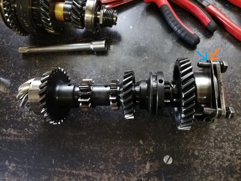 Regarde René, je pense que le réglage du couple conique se fait à l'aide des deux entretoises marquées d'une flèche orange pour la plus épaisse et bleue pour la plus fine qui doit faire à peine 0.10 ou 0.15 mm d'épaisseur