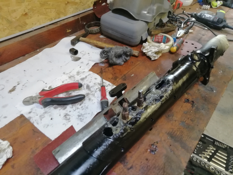 Pour les pots de suspension, mon père a dessoudé au niveau de la soudure a l'extrépité, puis ensuite, nous avons démonté l'intérieur, vérifié et ressouder
