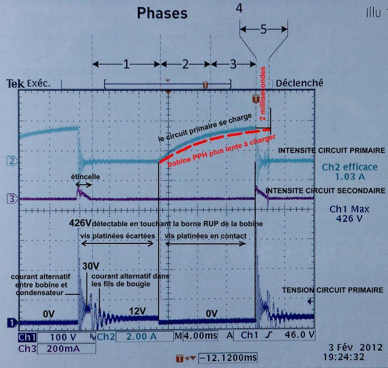 D'après des mesures faites par un ami, la tension de rupture au primaire à l'ouverture des vis platinées peut monter à 426 V. Citroën annonçait 300 V.