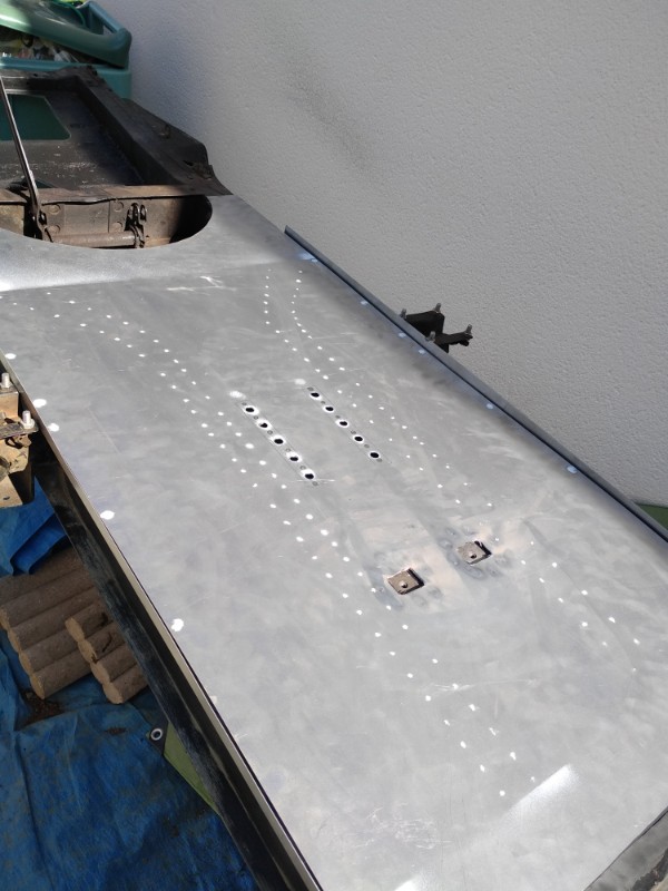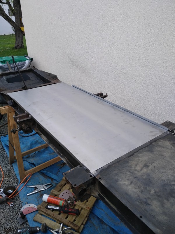 Je vais devoir faire le même travail pour mon AK400 ...AU final , quelle épaisseur de tôle tu as choisi ? Je vois sur les photos que tu as placé deux cornières le long du châssis, je suppose que tu vas les souder, replacer la plaque de fermeture et rabattre ensuite les cornières pour finir par les soudures...mes questions :