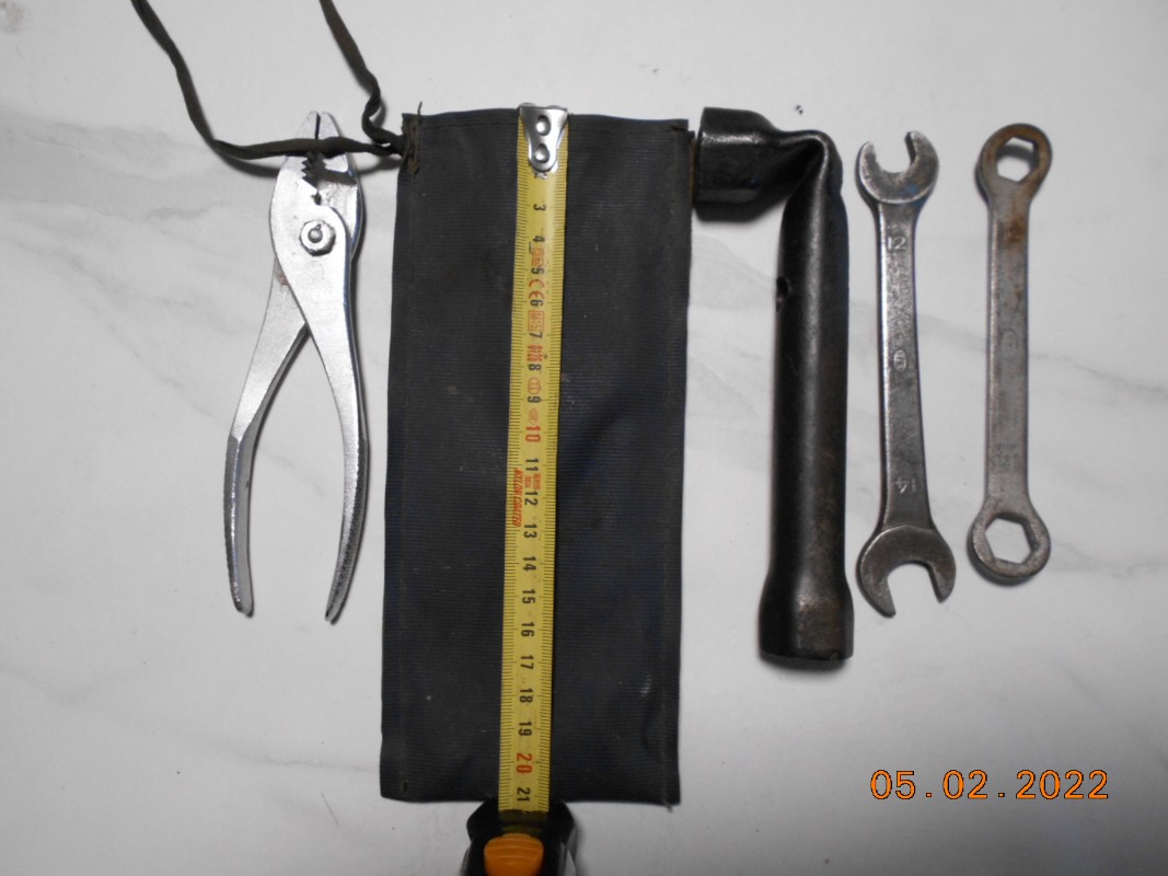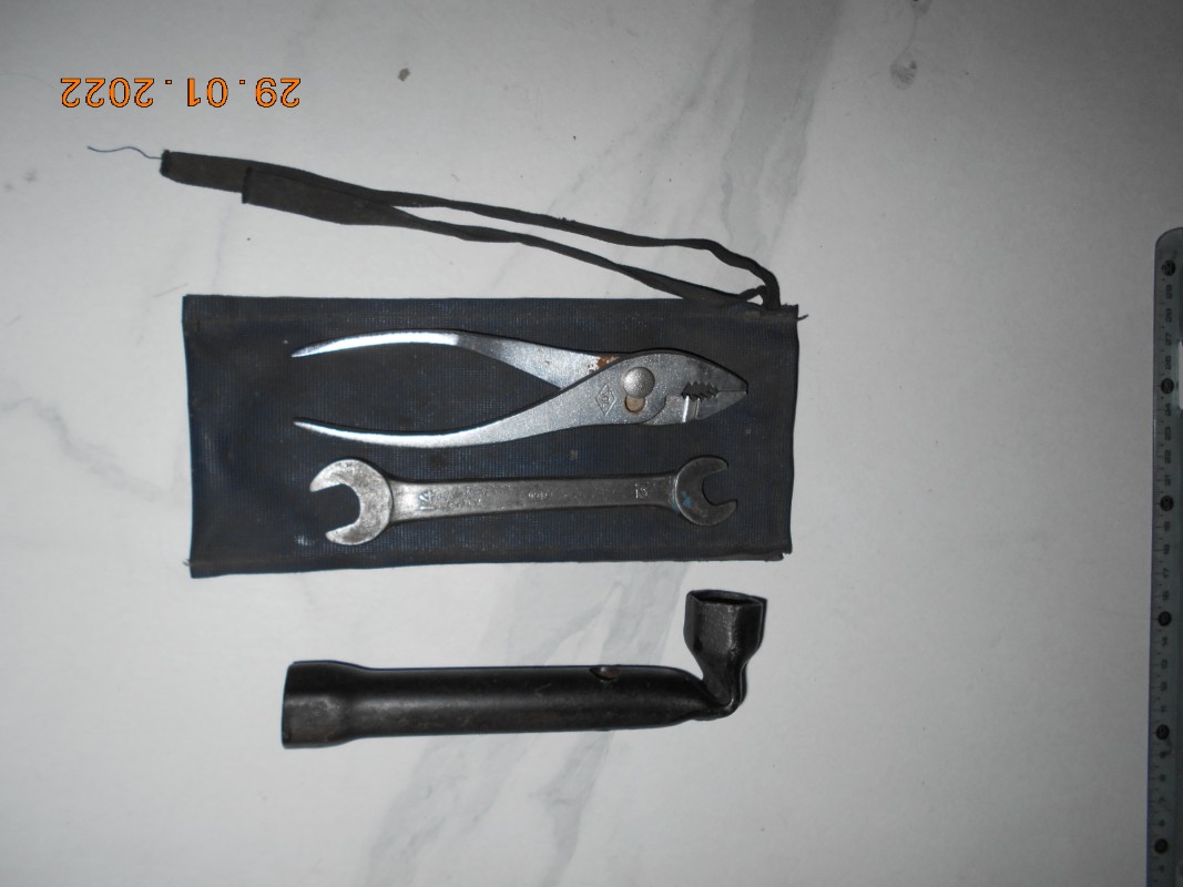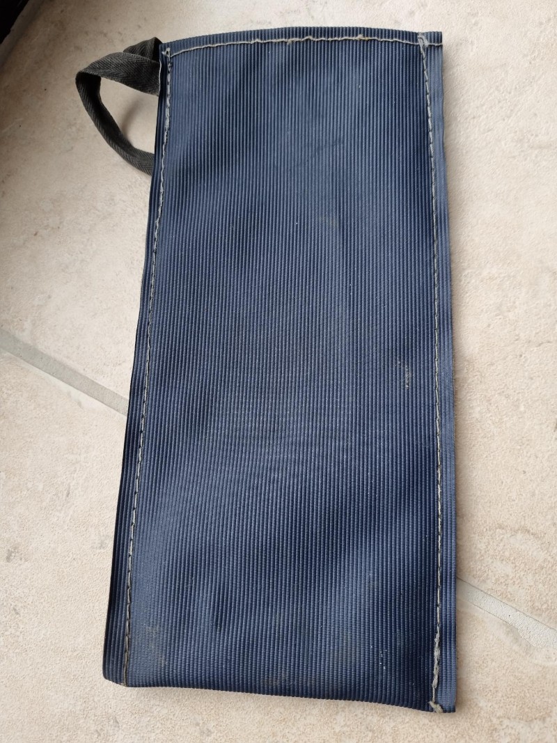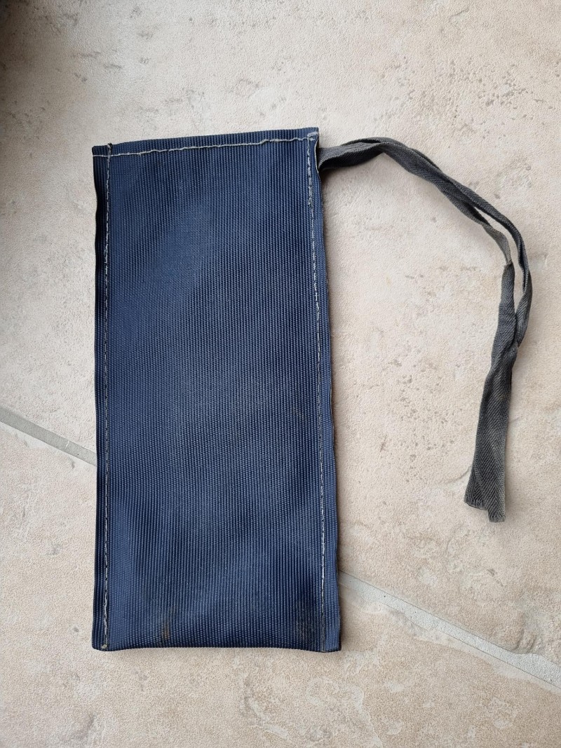 salut, belle trouvaille! elle est nickel la trousse; elle n'a jamais dû servir! ça ferait penser à la toile de capote coton rovyl gris bleu d'après 52 jusqu'en 56/57.... si elle est plutôt plastifiée ce serait alors à partir de fin 56, il y avait des capotes bleue foncée... Faudrait pouvoir comparer avec une capote de l'époque; il manque le tournevis; pour la pince, ça dépend de la toile de la trousse;