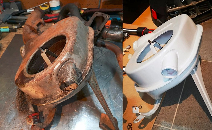 Après les carters en tole poncés , taraudés, et repeints, au tour de la boite à air passée en aprêt anti-rouille et en gris rosé