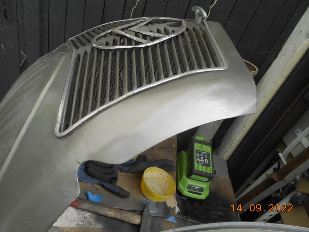 Technique classique; Débosselage tas et marteau et ensuite mastique Alu, puis mastique de finition.