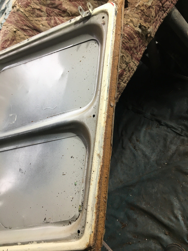 Eh bien, je ne suis pas déçu, la partie inférieure de chacun des éléments (portes et couvercle de malle) est pourrie, en miettes, en dentelles..