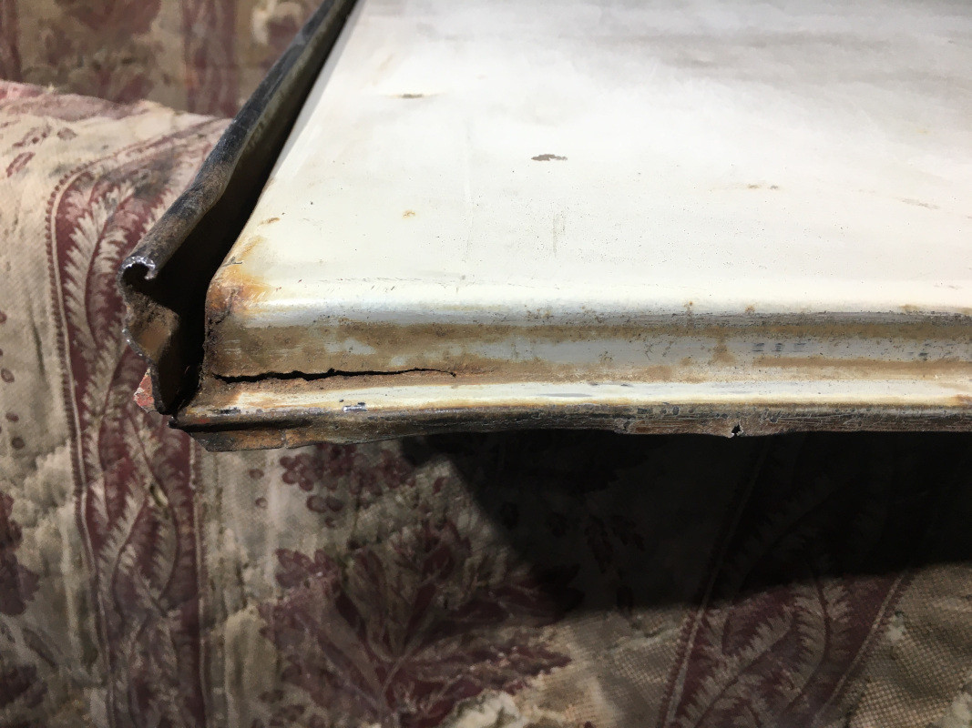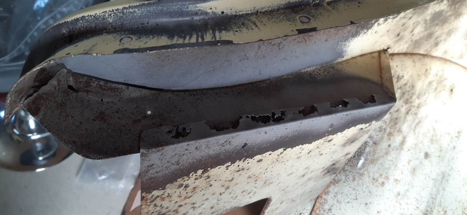 Mais je suis loin d'en être à ce stade ! Il me faut souder toutes les feuillures inférieures qui supportent le joint, il y a quelques fêlures sur la tôle extérieure, et le couvercle de malle est pourri dans sa partie inférieure..