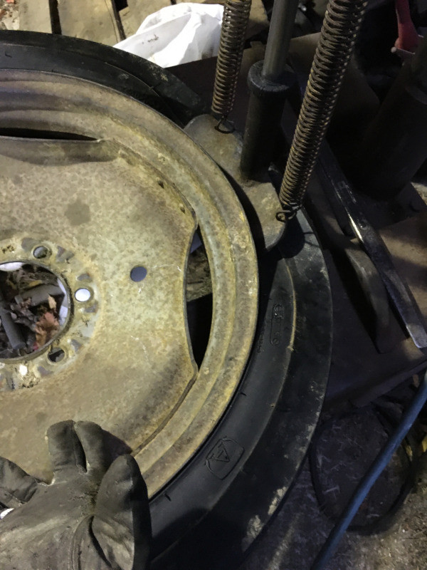 Mais à l'usage, je m'en sers aussi pour "monter" les pneus récalcitrants (ici, c'est un pneu de tracteur MF 835 renforcé pour aller dans les épines, et il a été très dur à monter !)