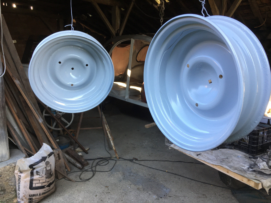 Une fois l'expérience passée, j'ai pendu les jantes afin de pouvoir les apprêter :