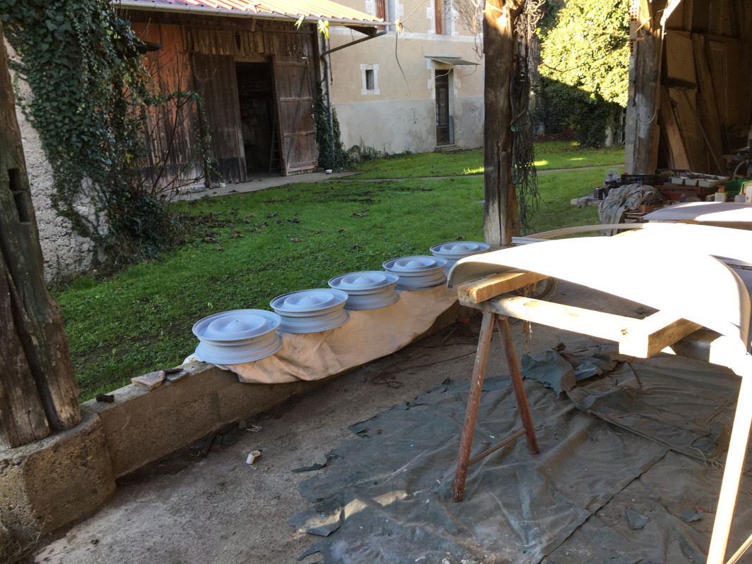 Les jantes ont été positionnées pour leur deuxième couche d'apprêt (après l'époxy, le garnissant !)