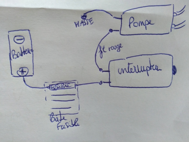 Sur mon schéma, le + de la pompe est relié à un bouton poussoir de commande de la pompe, pas directement sur le + batterie (sinon le moteur de al pompe est alimenté en permanence). Il faut donc créer un nouveau fil qui va du fusible + après contact vers ton interrupteur.