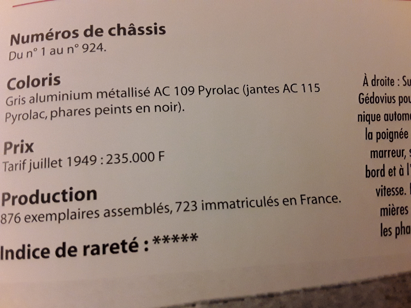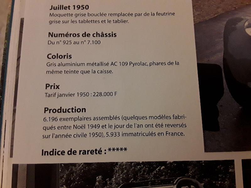 Sur le graphique je note 0 pour 1949 et 0 pour 1950. Or des 49 il y en a au moins cinq de recensées et des 50 beaucoup plus, rien qu'au Filles de Levallois il en a 13 ! Ca jette un gros doute sur l'ensemble. Pour moi, au pif, il en reste bien plus de 100 000 en France, ce qui en fait une voiture d'occasion et pas une voiture de collection !!! :shock:
