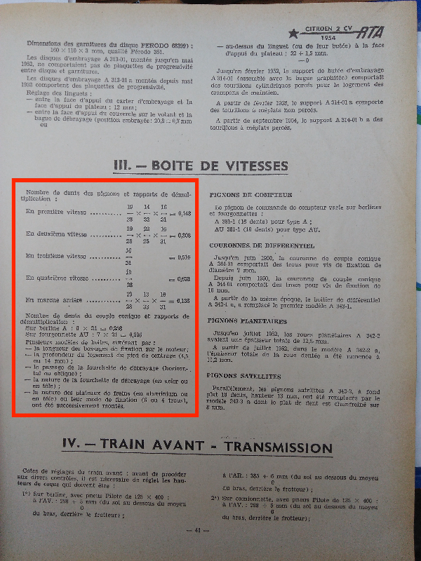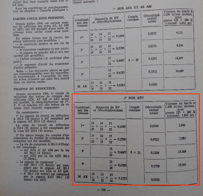Je vous mets en pièces jointes ce que j'ai trouvé dans la RTA, et précisément un paragraphe, qui, si j'ai bien compris, indique qu'entre 1956 et 1960 me semble t'il, les boite de A et AZU étaient les mêmes. La RTA indique aussi que pour l'adapter sur un moteur ancien (donc de A de 52 pour mon cas), il faut changer le disque d'embrayage et l'arbre de commande