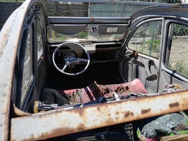 Cette jolie nouvelle est arrivée sur les jantes après avoir passé un bon moment dans une casse à ciel ouvert ! A priori stockée pendant longtemps dans un garage Citroën au sec en Ardèche elle a finit à la casse suite à la fermeture et disparition du garage. Au niveau de l'état général on pourrait s'attendre à pire vu son âge mais le chassis semble bon et la caisse n'est pas pire ! Les planchers et le pédalier sont évidemment à changer. Le moteur tourne mais m'inquiète pas mal par son manque de compression... Je ne connais pas le 425cm et seulement le 602 mais à priori c'est quand même très ressemblant, y a t il des différences notables à connaitre ? :) Le maitre cylindre est lui bien rongé par la rouille et les joints sont bien rongés également, il sera donc surement à refaire/changer.
