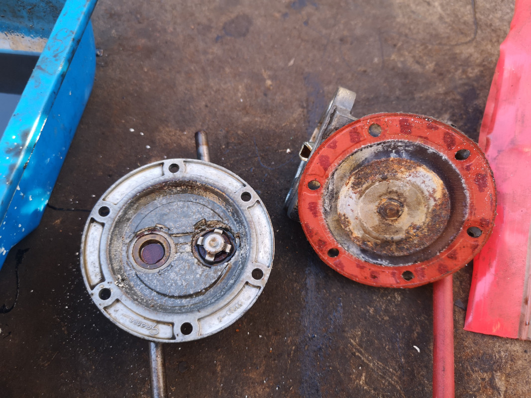 On termine le nettoyage de tout l'ensemble (intérieur et extérieur): perso j'attaque avec une brosse en plastique et de l'essence partout et brosse en fer manuelle pour les coins les plus réticents. Pour que la pompe fonctionne bien et ne pédale pas dans le vide, les deux clapets sont vérifiés. Ils doivent être libres et s'ouvrir facilement en appuyant avec un tournevis (le ressort qui les maintient fermés n'est pas très dur). Pour vérifier leur étanchéité, je bouche la zone du couvercle avec la paume de ma main et je souffle/aspire dans les deux raccords.