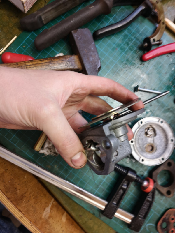 Pour sortir l'ancienne membrane, j'ai un peu galéré... Il m'a fallu une heure pour piger qu'elle était bloquée par le levier de la pompe! Il faut donc le démonter en chassant l'axe. Attention, il y a deux ressorts: un sous le levier, un autre sous la membrane. Celui du levier a sauté et a traversé le garage :boulet2: