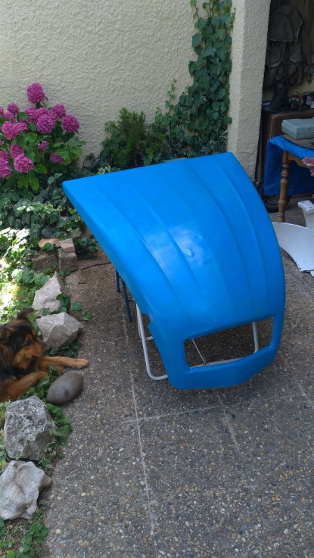 Pour le moment j'ai effectué de petites restauration à mon niveau : garnitures intérieures (habillage en feutrines), la calandre, la feutrine isolante du capot, dégripper les commandes de chauffage et la réglette des phares, changes les garnitures, etc. Prochainement je reçois et j''installe les enjoliveurs, et les garnitures pour le tablier intérieur. J'aimerai aussi changer la capote beige pour une capote noire qui serait mieux assortie avec une carrosserie bleu.