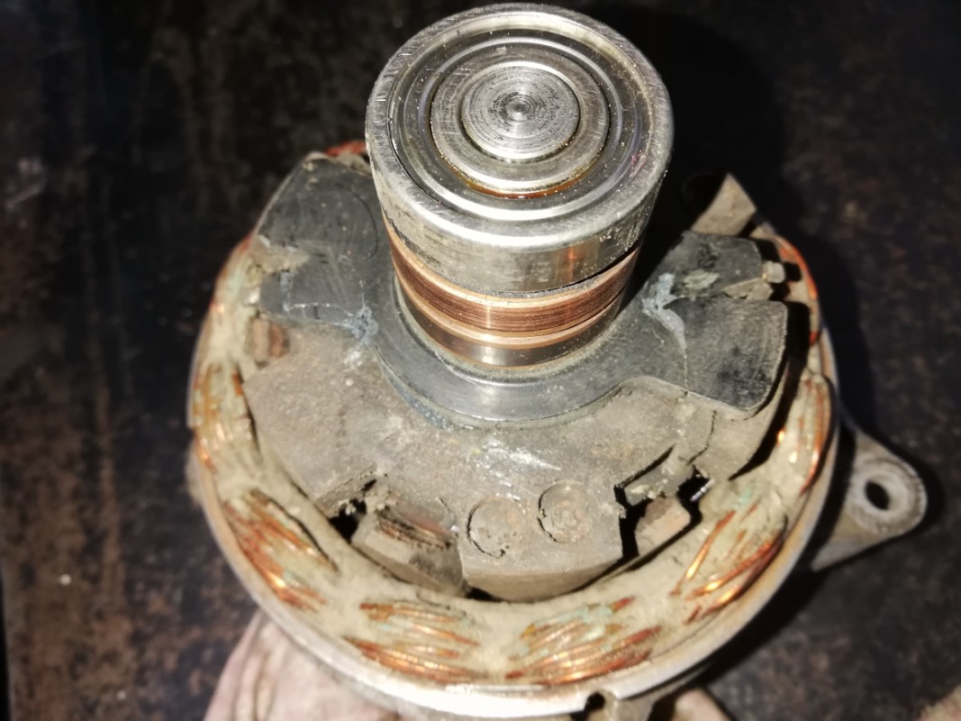 Cet après midi, retour à l'atelier, tranquillement penché sur l'alternateur de marque FEMSA...j'ai pris la décision de l'ouvrir et bien m'en a pris car il est dans un sale état : Je pense même qu'il est H.S. un des deux charbons est mort. Le roulement est fichu aussi.
