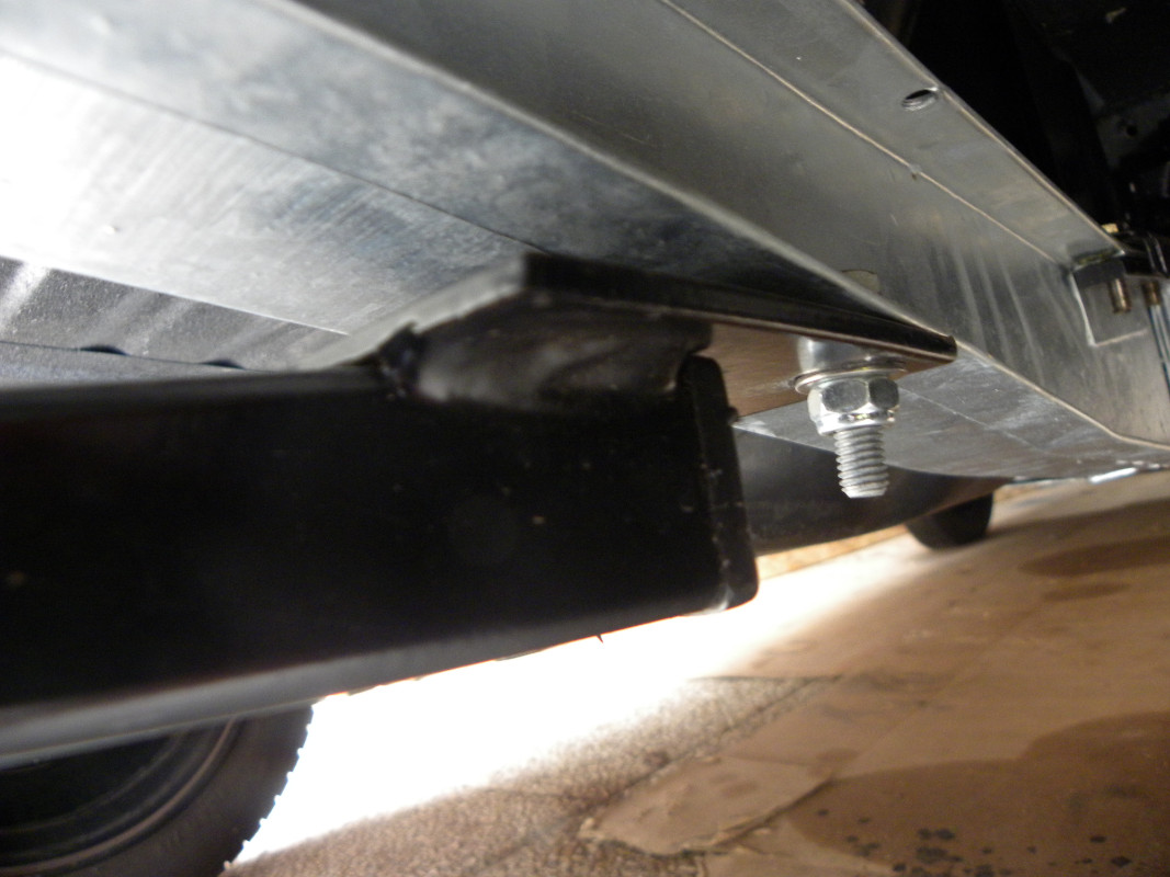Ensuite tu positionnes l'ensemble (support pare choc + plaque non peinte + attelage ) en bloquant la pièce non peinte avec les supports de pare chocs en fonction des trous que tu as sur la plaque (tu n'as rien à percer à ce stade) contre le bout des longerons (voir photos). Tu positionnes (on va dire presque à blanc) l'ensemble sous la caisse pour trouver exactement à quel endroit précis tu vas devoir percer les lèvres extérieures des deux longerons arrière. Perso, j'avais mis des cartons pour maintenir l'attelage en place (plaqué contre le dessous de la caisse) pour ne pas galérer.