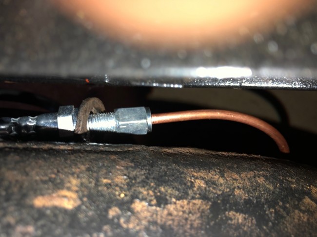 Pas trop propre mais on voit l'écrou qui vient serrer le raccord du flexible sur le support. On voit aussi que le flexible n'est pas reluisant, va falloir que je songe à le changer !