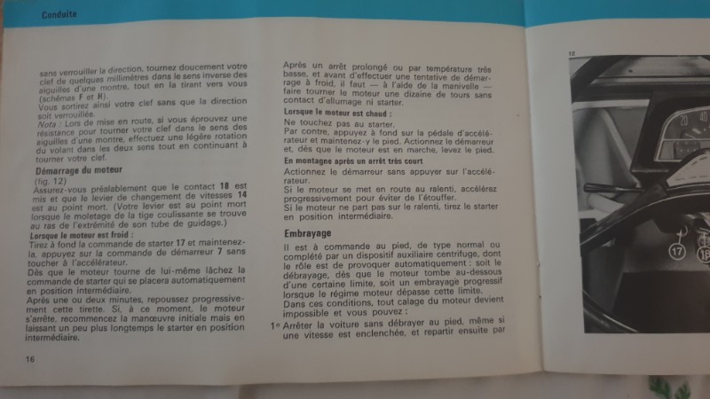 A froid, starter tiré à fond et maintenu tiré,sans toucher à l'accélérateur. Dès que le moteur tourne relâcher le starter qui doit se mettre de lui-même en position intermédiaire. Démarrer la voiture et au bout de quelques centaines de mètres repousser le starter à fond.